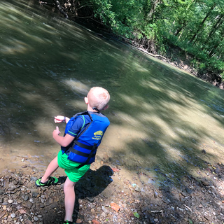 I find Hayden cruising the shallow creek that runs along the road by our campsite…