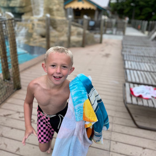 We find chairs in under a pavilion at the wave pool to chill in while waiting … an hour later all clear!! The boys run into the wave pool to get wet… maybe 5 minutes..
