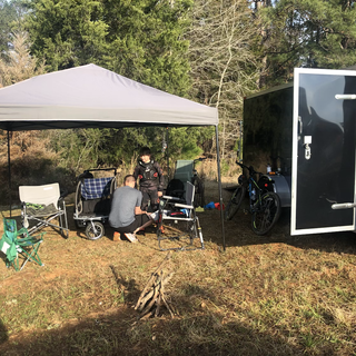 We roll into the track looking for a good spot to set up.. we found an area along the tree line to drop our trailer and pop up our canopy. The track goes right behind us in the woods so we’ll be able to see bikes going through a short section.